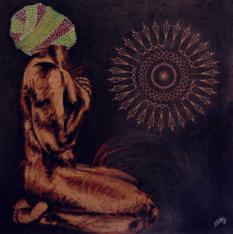 , Olwethu De Vos , Pastel, charcoal, staples, copper, wire, and blow torch on board.